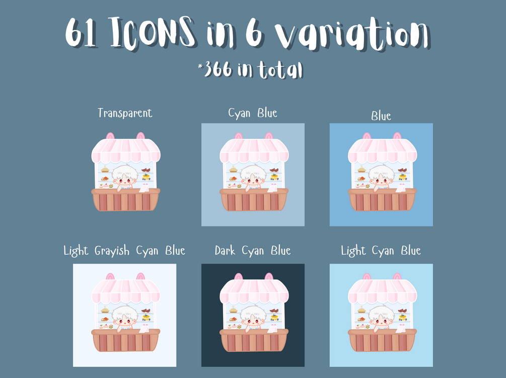 • 366 total icons (61 unique icons in 5 colors + 1 transparent version)